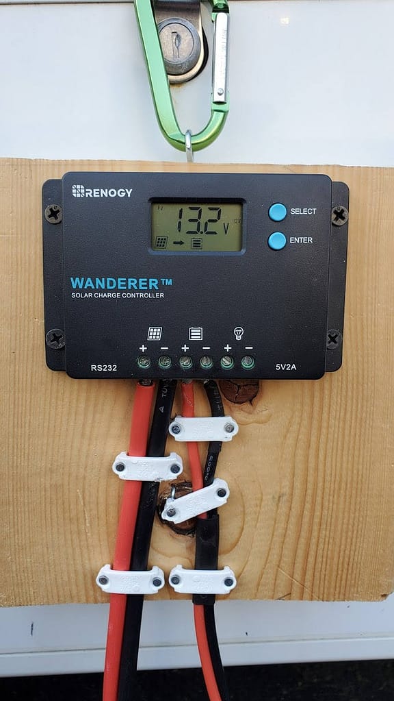 Then I mounted the solar charge controller to a scrap piece of wood, secured the wires to the SAE connector and the solar panels, to avoid them getting pulled easily free. Then I added an eye hook and carabiner on top, to hang the charge controller from one of my storage doors.